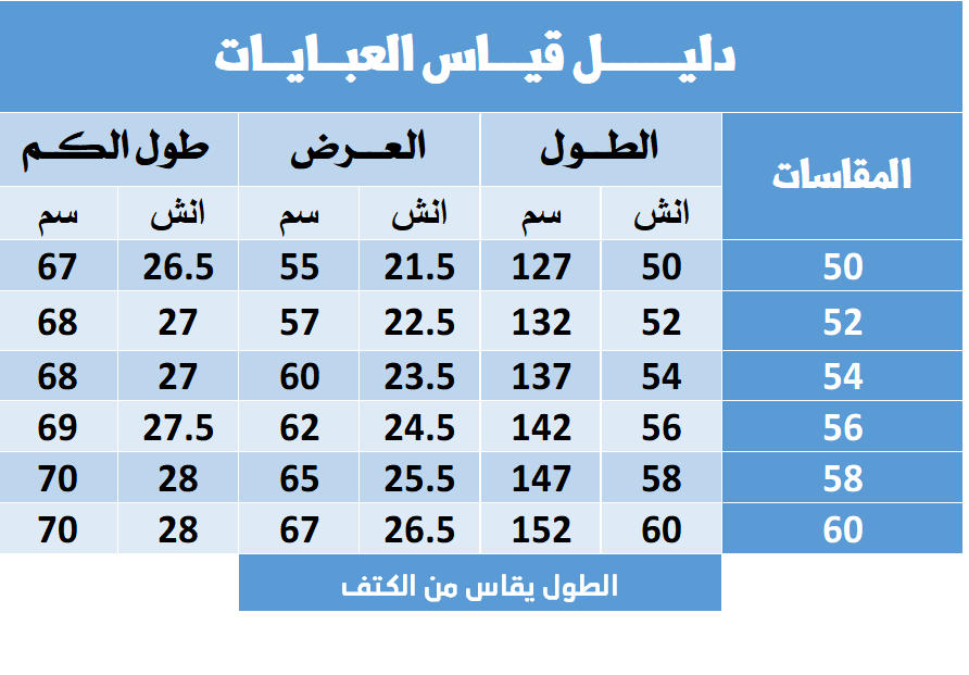 طول العباية يؤخذ من الكتف الى أسفل الكعبين (من الأمام)